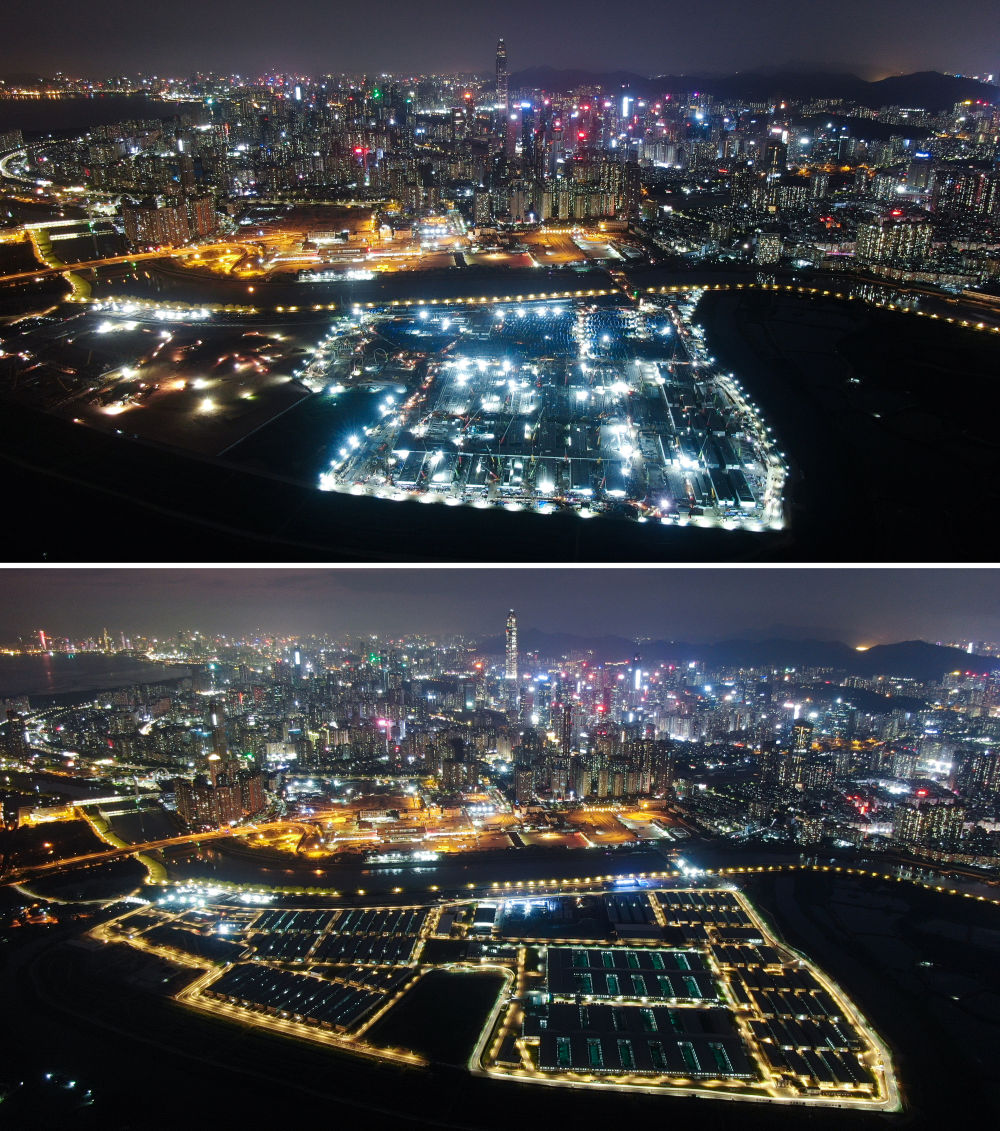 這是中央援港應急醫院和落馬洲方艙設施項目完工前后對比照片(上圖拍攝于3月6日,下圖拍攝于5月5日)。