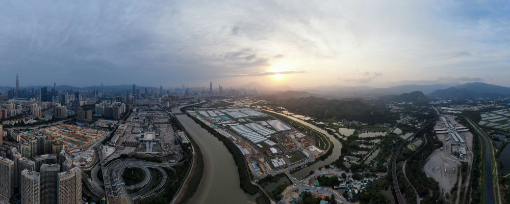 4月3日,夕陽(yáng)下的落馬洲河套地區,中央援港應急醫院如一葉方舟。