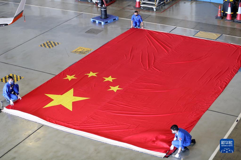 直升機務(wù)教官蔡澤民套上鞋套,戴上白手套,拿著(zhù)夾有《國旗及國徽條例》的文件夾,一一對照檢查。國旗是在具備資質(zhì)的廠(chǎng)家專(zhuān)門(mén)定制的,規格規范都有嚴格要求。國旗大,就有拼接。蔡澤民主要查看色澤是否飽滿(mǎn)和均勻,接縫是否平整,四條邊上有沒(méi)有線(xiàn)頭等,特別要注意的是,五顆星星處不可有接縫。一番操作下來(lái),后背已然濕透。