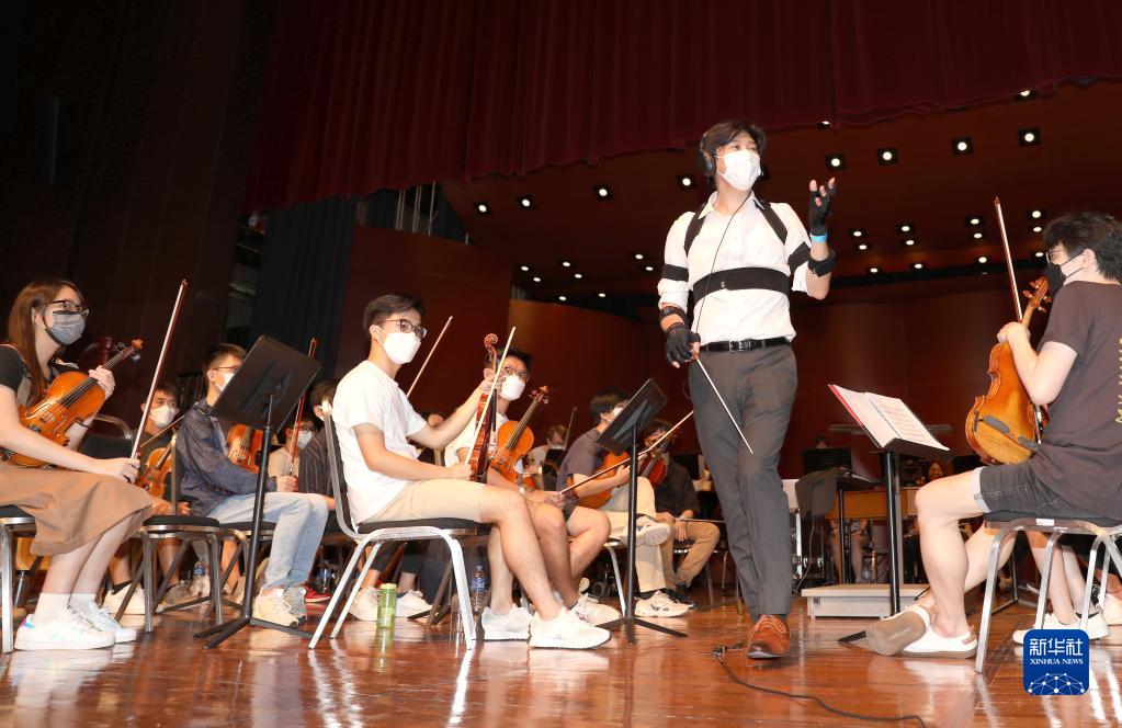 在彩排中,香港浸會(huì )大學(xué)交響樂(lè )團音樂(lè )總監潘明倫身上多處綁著(zhù)傳感器,他不時(shí)與臺下的技術(shù)團隊進(jìn)行溝通(7月11日攝)。新華社記者 吳曉初 攝