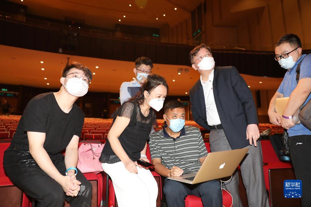人工智能專(zhuān)家、浸會(huì )大學(xué)副校長(cháng)郭毅可(右二)在彩排現場(chǎng)(7月11日攝)。新華社記者 吳曉初 攝
