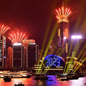 1月1日,香港維多利亞港上演“幻彩詠香江”加強版煙火光影匯演,迎接2023年的到來(lái)。新華社記者 陳鐸 攝