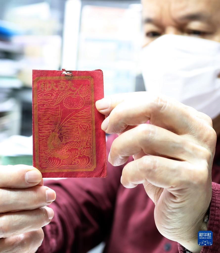 香港歷史博物館名譽(yù)顧問(wèn)鄭寶鴻展示自己收藏的利是封(1月13日攝)。新華社記者 李鋼 攝