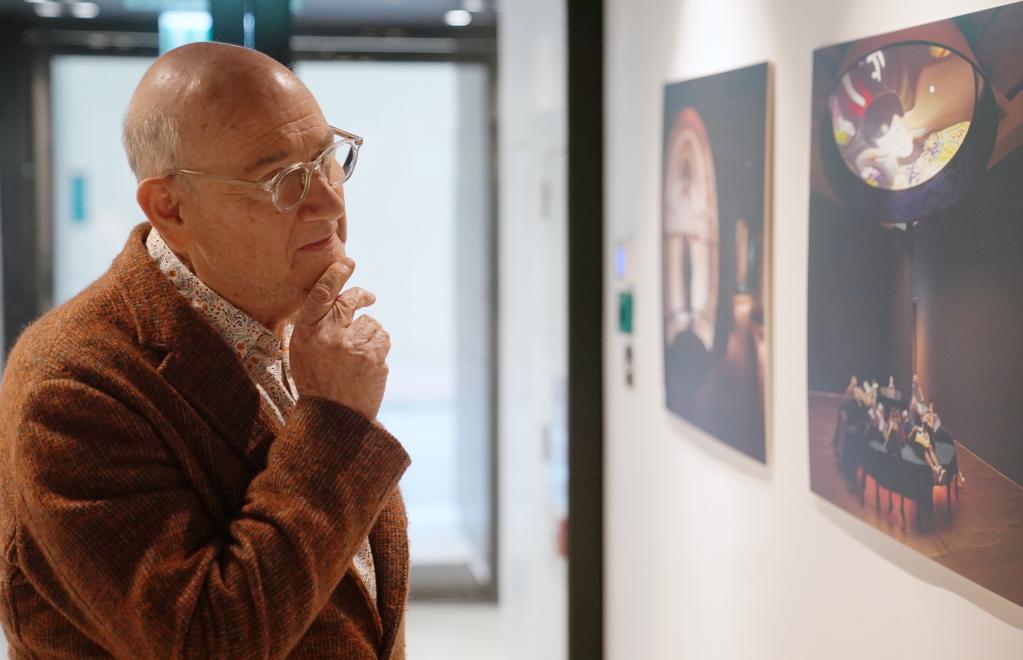 在香港浸會(huì )大學(xué)視覺(jué)化研究中心,香港浸會(huì )大學(xué)視覺(jué)藝術(shù)院講座教授、藝術(shù)家邵志飛在自己的作品前駐足(5月11日攝)。新華社記者 王申 攝