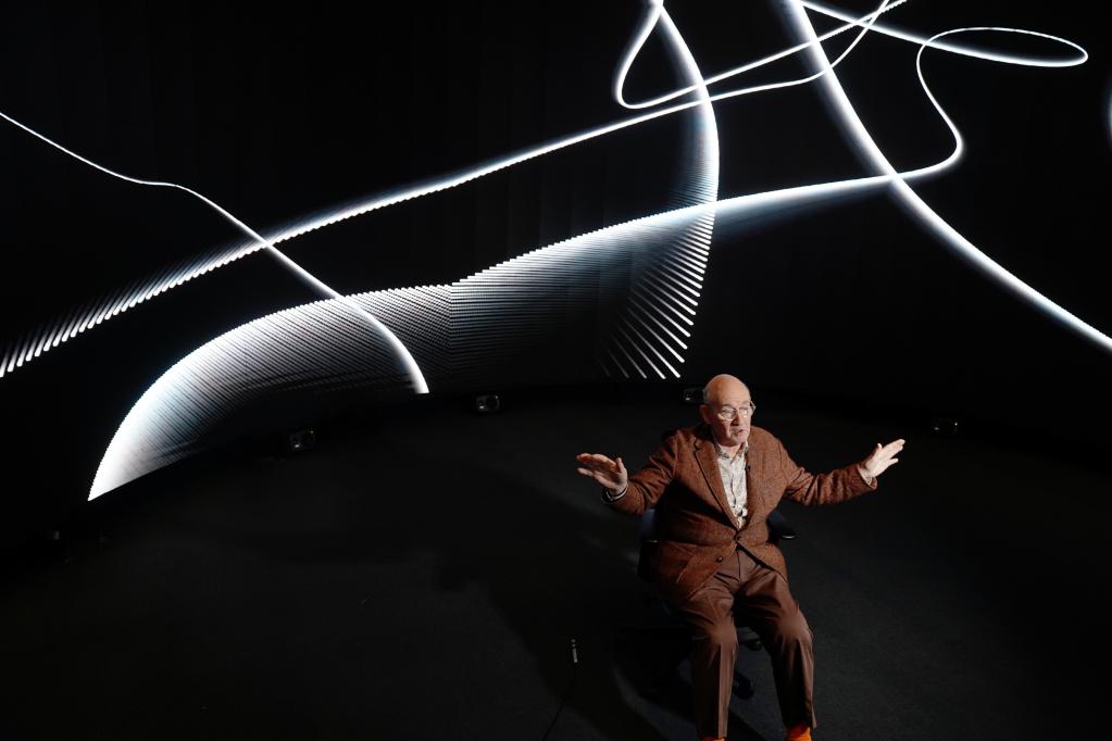 在香港浸會(huì )大學(xué)視覺(jué)化研究中心,香港浸會(huì )大學(xué)視覺(jué)藝術(shù)院講座教授、藝術(shù)家邵志飛在配備有傳感器和生物識別技術(shù)的全景影院中展示作品(5月11日攝)。新華社記者 王申 攝