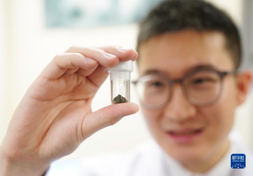 香港大學(xué)地球科學(xué)系博士后研究員錢(qián)煜奇向記者展示由中國探月工程嫦娥五號帶回地球的月壤(8月22日攝)。新華社記者 王申 攝