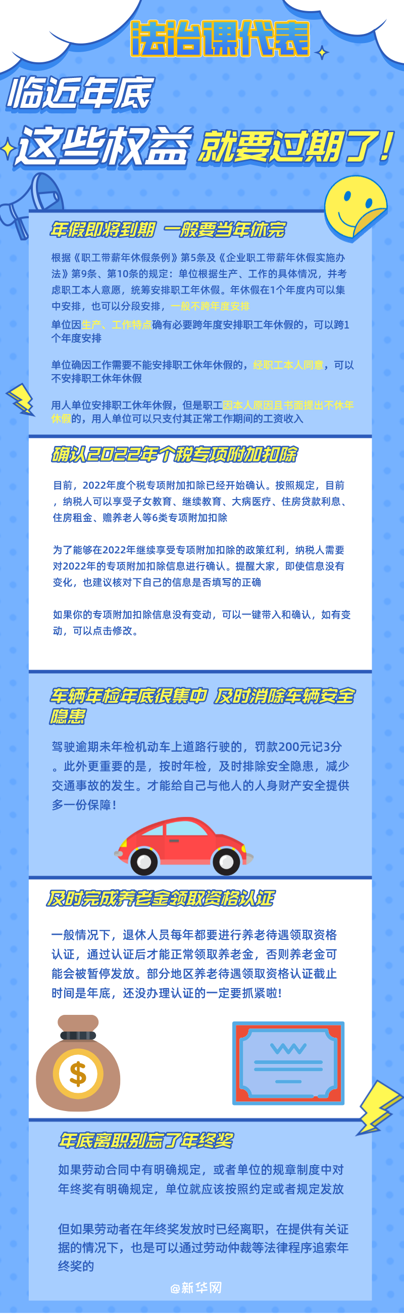 ????新華網(wǎng)北京12月15日電(記者 盧俊宇)2021年即將過(guò)去,臨近年底,一些與切身權益息息相關(guān)的事項就要“過(guò)期”了,再不抓緊可能會(huì )錯過(guò)。本期法治課代表帶你一塊看看都有哪些?