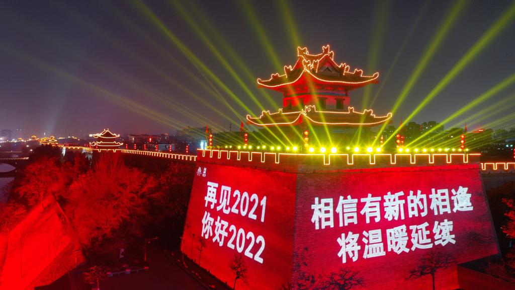 新年的鐘聲剛剛敲響,一束光影打在西安古城墻上,映出幾行字跡。