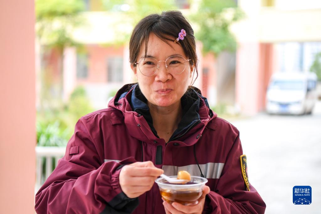 2月15日,流調隊員姚雪婷在吃廣西德??h城關(guān)鎮蓮城社區居民制作的手工湯圓。新華社記者 曹祎銘 攝