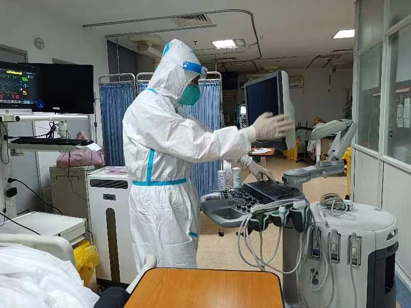 “徐敏,你要特別留意這個(gè)病人,84歲的患者周爺爺心梗,心功能差,心率慢、血壓偏低,同時(shí)患者合并有肝功能、腎功能、凝血功能等多臟器功能不全?!痹诤显疁t療隊隊員、湘雅二醫院重癥醫學(xué)科主任李金秀的指導下,徐敏和同事通過(guò)床旁超聲檢測儀器對周爺爺的心肺及其他臟器功能進(jìn)行評估。