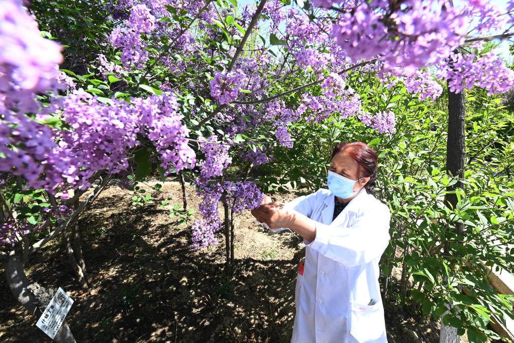 圖為5月5日在西寧市林業(yè)科學(xué)研究所,所長(cháng)張錦梅查看什錦丁香長(cháng)勢情況。新華社記者范培珅 攝