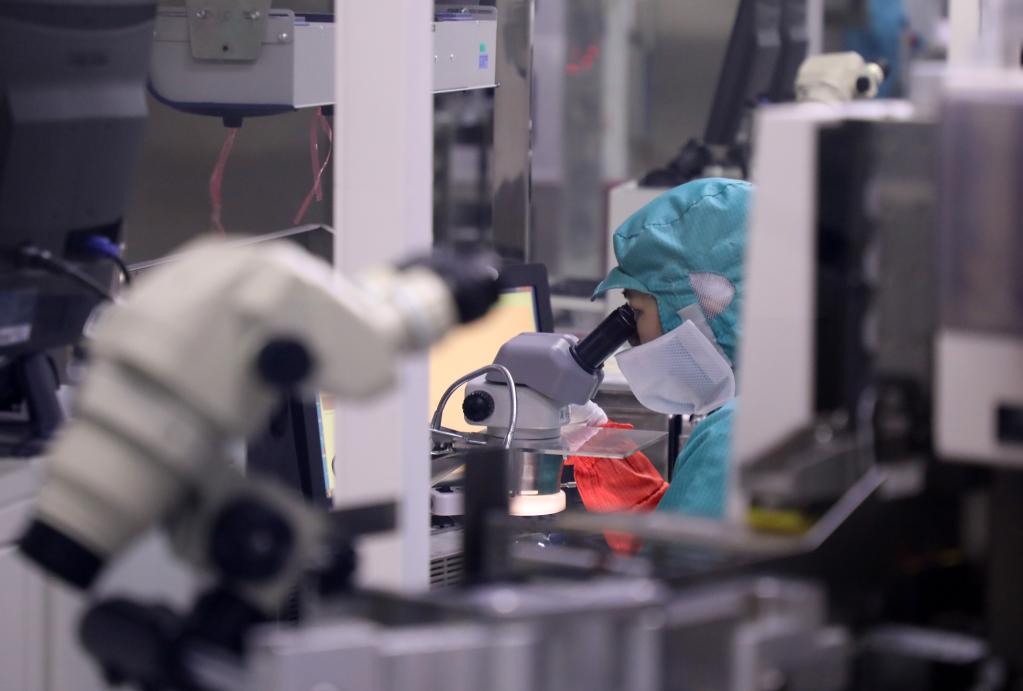 聯(lián)測優(yōu)特半導體(東莞)有限公司員工正在檢測半導體產(chǎn)品(2022年4月27日攝)。新華社記者 黃國保 攝
