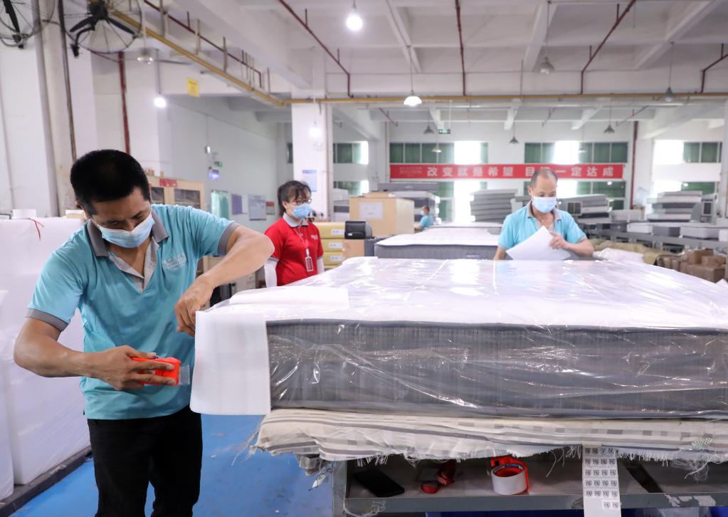 運時(shí)通(中國)家具有限公司員工正在做產(chǎn)品包裝(2022年4月27日攝)。新華社記者 黃國保 攝