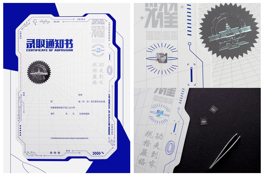 2022年哈爾濱工業(yè)大學(xué)的錄取通知書(shū)外觀(guān)酷似芯片主板,科技感十足。正面封固有學(xué)校自主研制的金剛石或藍寶石,背面可呈現夜光效果。希望2022級新生通過(guò)學(xué)識的雕琢、人生的磨礪和心智的錘煉,在未來(lái)的人生路上閃耀出不一樣的光彩。