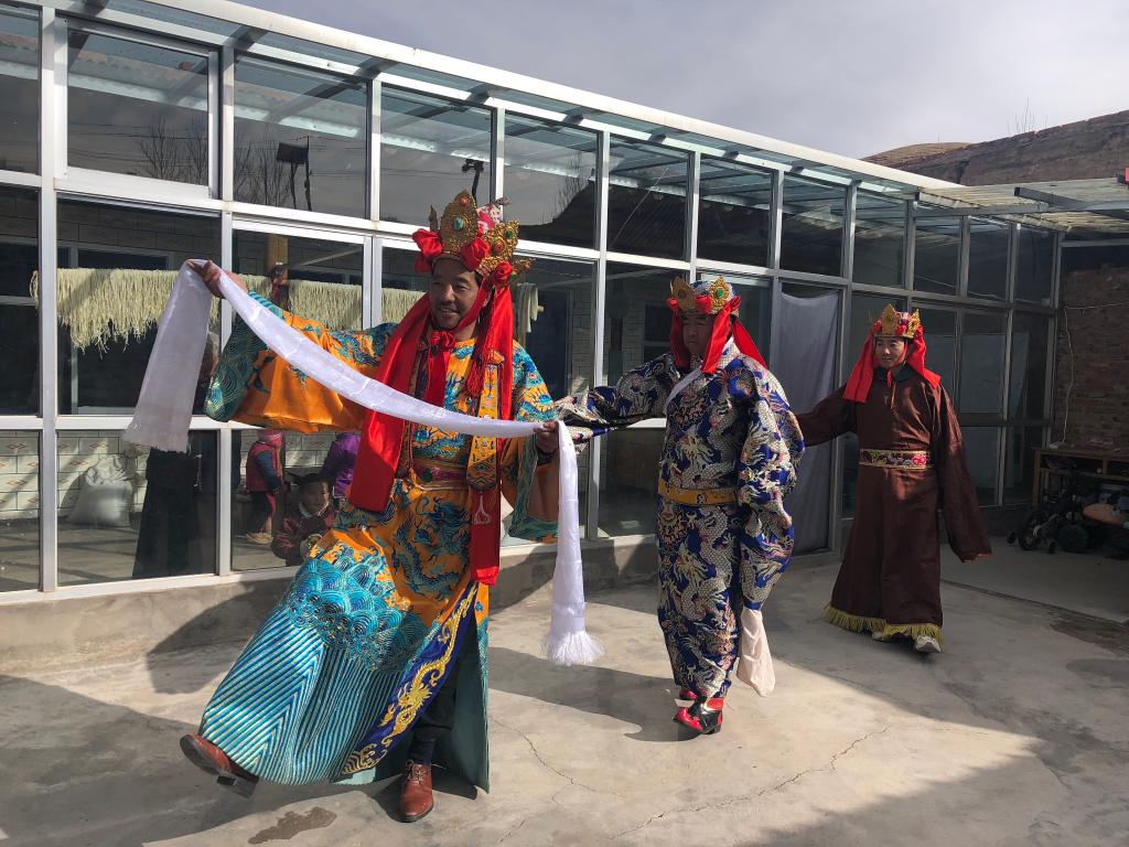多杰扎西(左一)在自家院子里排練藏戲。新華社記者白瑪央措 攝