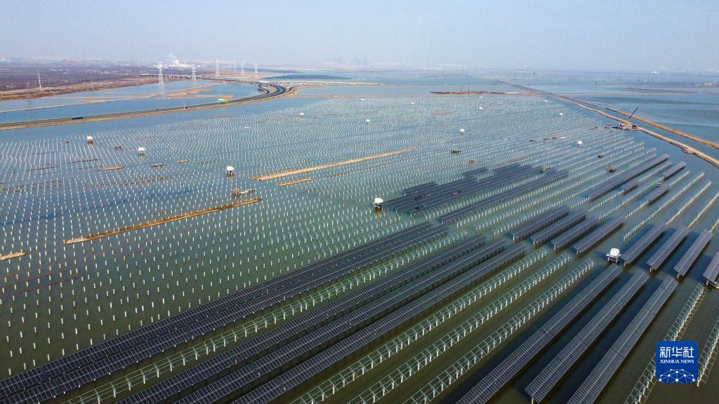 2月7日拍攝的建設中的天津濱海新區龍源海晶鹽光互補項目(無(wú)人機照片)。新華社記者 孫凡越 攝