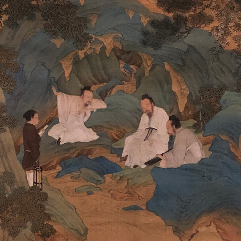 這幅取材于陶淵明《桃花源記》的畫(huà)作,以精工的畫(huà)筆描繪了人們心中的桃源之景。其構圖采取北宋全景式大山大水的布局特征,視野開(kāi)闊,境界宏大,疏密對比強烈。圖中山石矗立,虬松盤(pán)繞,圖的下方有三位文人雅士臨流而坐,一人乘興撫琴,一人低首聆聽(tīng),一人身倚山石,橋下溪水清澈,坡上桃樹(shù)林掩映于山石、樹(shù)木之間,展現出一個(gè)遠離世俗、虛幻縹緲的人間仙境。