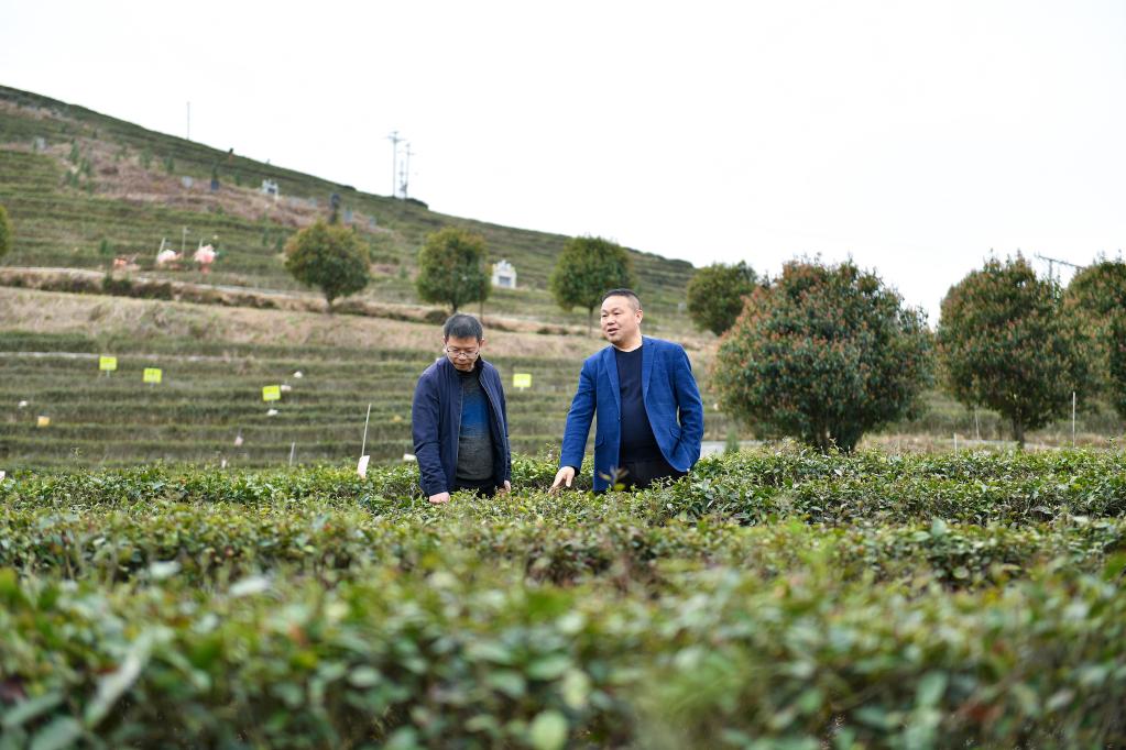羅新亮(右)在茶園查看茶葉長(cháng)勢。新華社記者陳振海 攝
