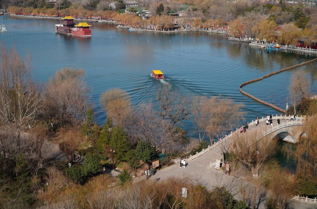 山東省濟南市天下第一泉風(fēng)景區,游客在大明湖游覽。新華社記者徐速繪 攝
