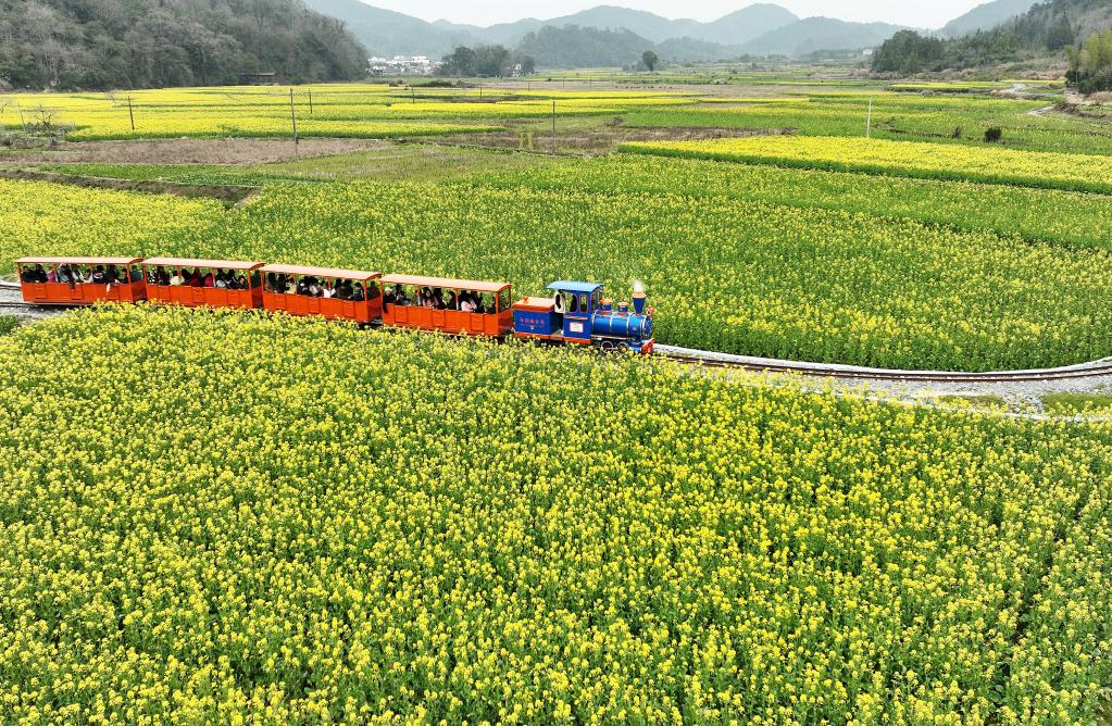 游客在婺源乘坐“小火車(chē)”觀(guān)賞花海。新華社記者 萬(wàn)象 攝