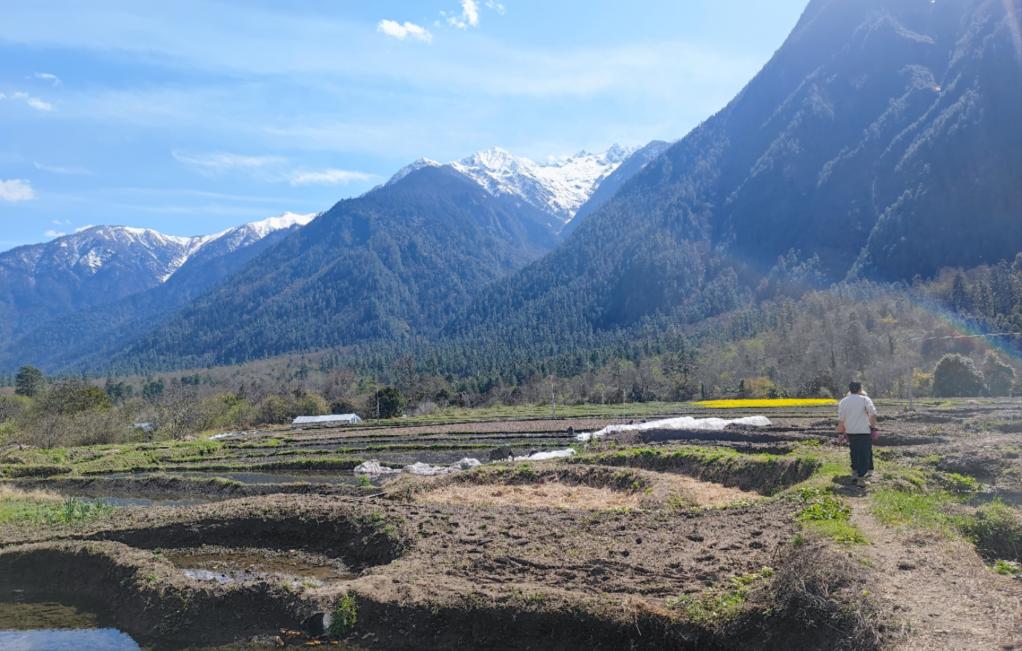 西巴村一片片沃野鑲嵌在翠綠的山巒之間,油菜花、桃花點(diǎn)綴其間,映著(zhù)遠處的雪山,勾勒出一幅色彩斑斕的圖景。