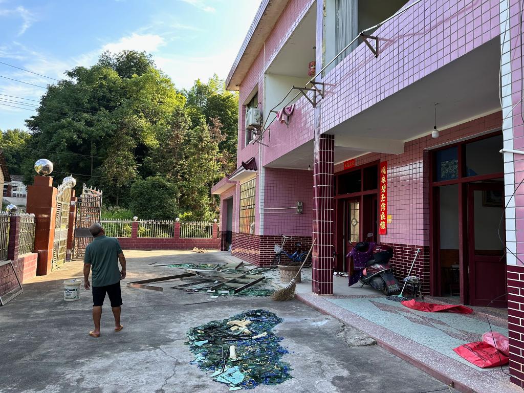 11日,村民正在清理受損的門(mén)窗。(新華社記者 謝奔 攝)