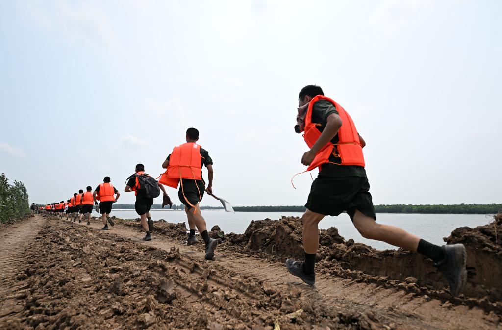 8月11日,武警第一機動(dòng)總隊某支隊官兵在堤壩上奔赴搶險點(diǎn)。新華社記者 趙子碩 攝
