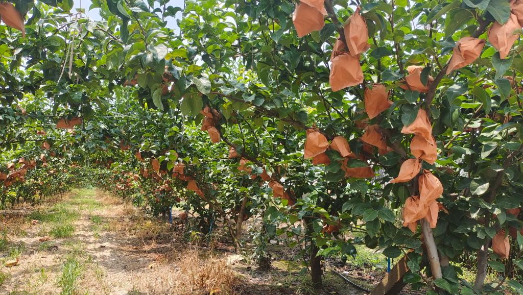 趙玉芹家的梨園中,橙色的果袋點(diǎn)綴在枝葉間。新華社記者叢佳鑫 攝