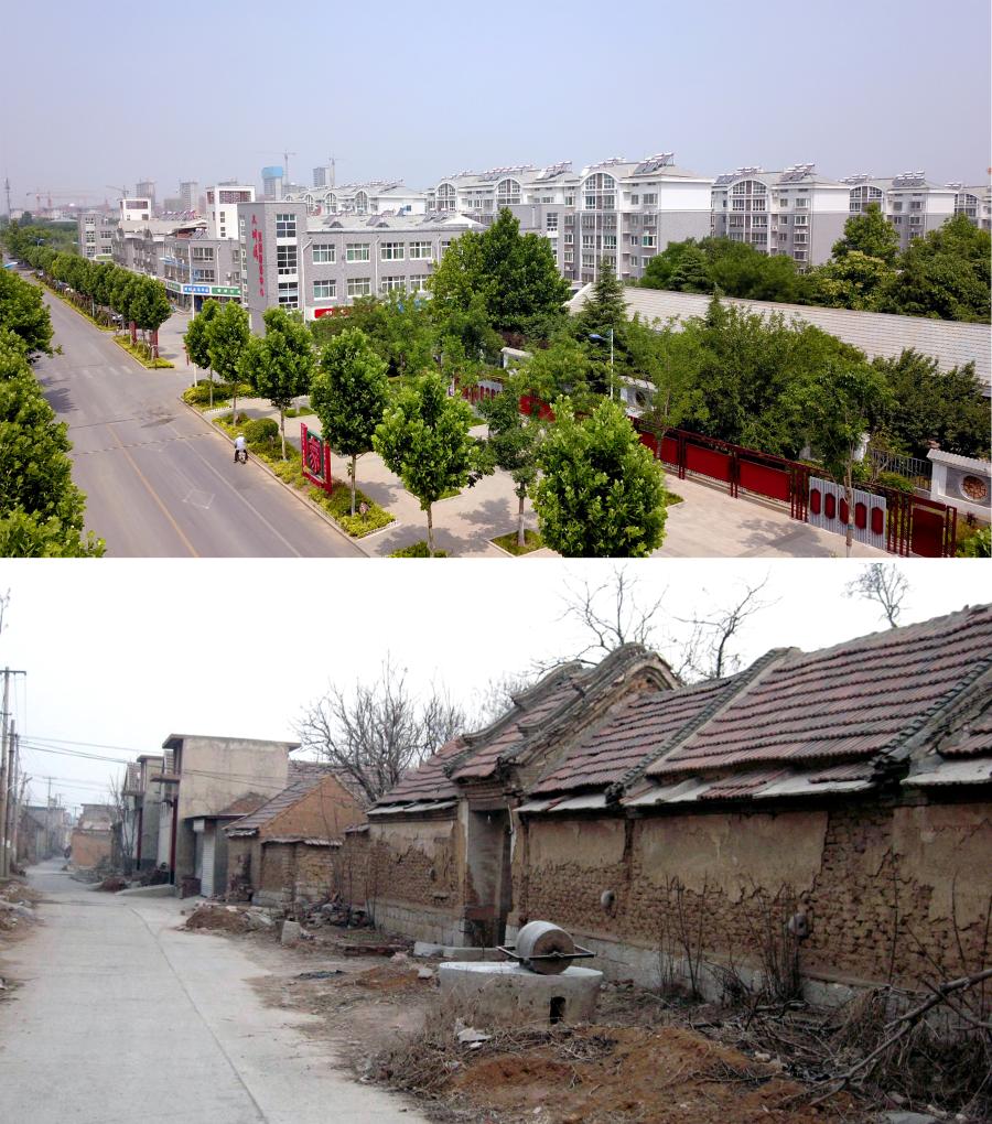 這是一張拼版照片。上圖為濟南市章丘區三澗溪村新貌(新華社記者郭緒雷 攝,無(wú)人機照片);下圖為三澗溪村舊貌(資料照片)。