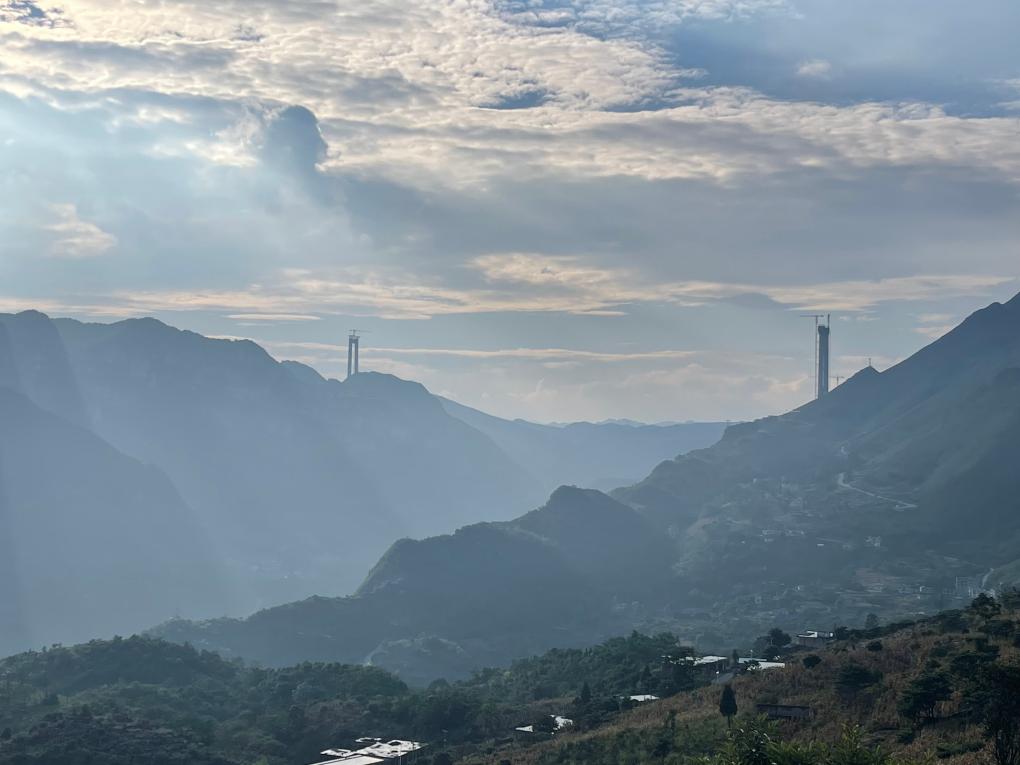 10月1日清晨,當陽(yáng)光穿過(guò)云霞,照耀在位于貴州省貞豐縣境內的花江峽谷大橋安龍岸主塔上時(shí),高空吊裝工人馬海扯坡早已穿戴好安全設備,開(kāi)啟了在200多米高空忙碌的一天。