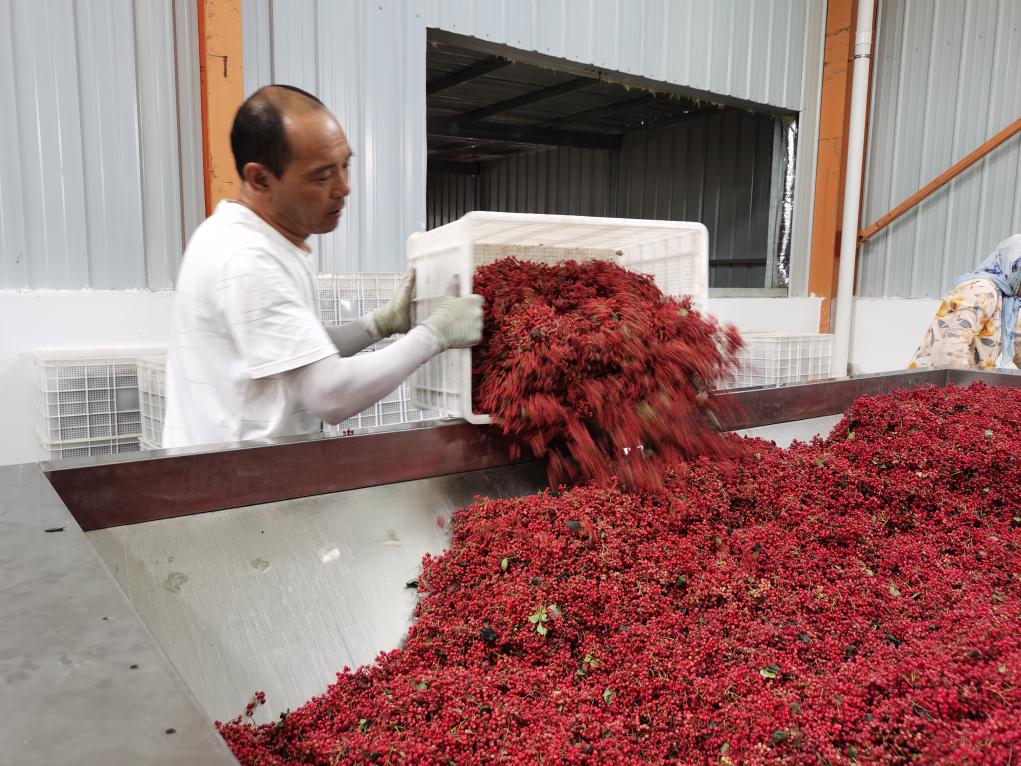 一位村民正在新義村的花椒加工廠(chǎng)里加工花椒。(受訪(fǎng)者供圖)