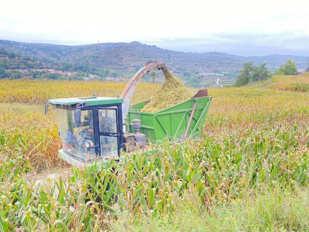 在新義村的一處農田里,玉米青儲機正在作業(yè)。(受訪(fǎng)者供圖)