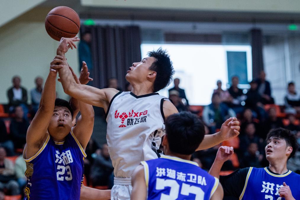 10月3日,“油燜大蝦隊”球員(左二)與“洪湖赤衛隊”球員在2023年湖北省潛江市和美鄉村籃球聯(lián)賽邀請賽中拼搶。新華社記者伍志尊 攝