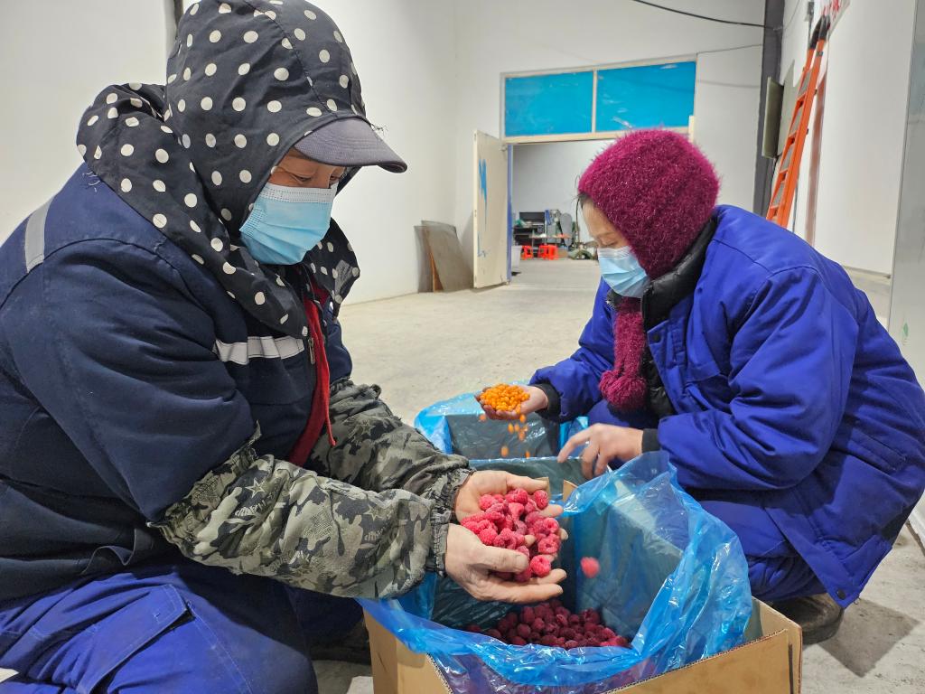 黑龍江禾發(fā)農業(yè)科技有限公司工作人員在分揀紅樹(shù)莓和沙棘凍果。新華社記者張玥攝