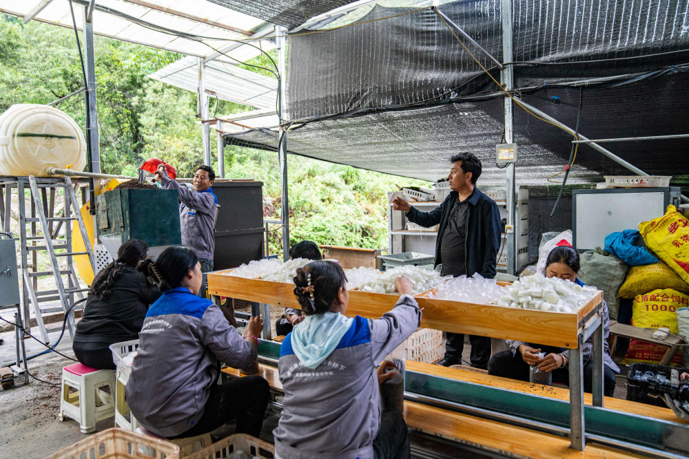 在墨脫縣格當鄉尼日卡林下資源種植合作社,貢秋次仁(右二)指揮工人生產(chǎn)菌包(2023年10月12日攝)。新華社記者 孫非 攝