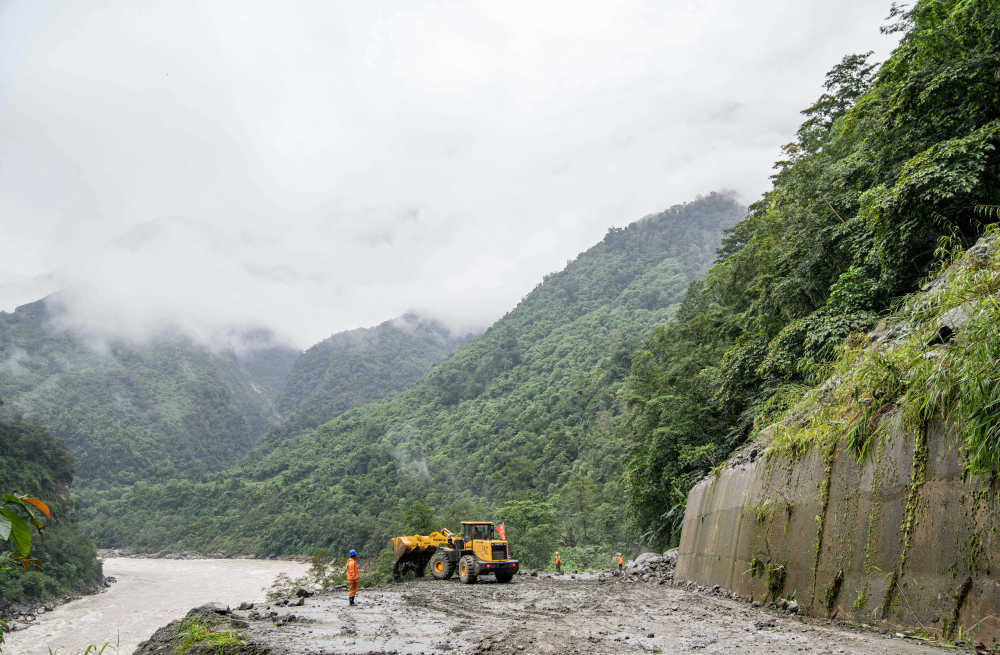 在墨脫縣格當鄉,工作人員在搶通道路(2023年10月12日攝)。新華社記者 孫非 攝