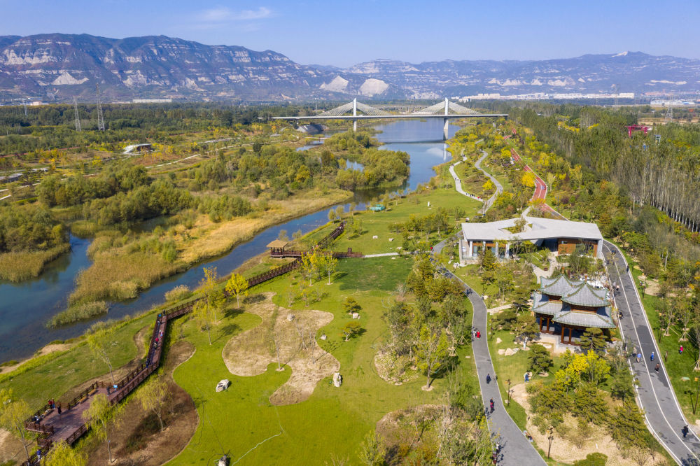 這是在山西省太原市拍攝的位于汾河畔的雁丘園(2023年10月10日攝,無(wú)人機照片)。新華社記者 楊晨光 攝