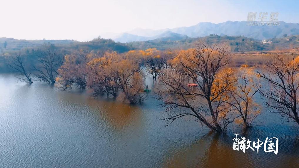 初冬時(shí)節,河北省石家莊市贊皇縣的平泉湖靜靜地安臥于群山環(huán)抱之中,舉目望去遠山如黛,澄澈碧藍的湖水煙波浩渺,山水相映??每昧鴺?shù)婀娜多姿,映著(zhù)清澈的湖水,似美人照鏡,明艷動(dòng)人,美不勝收。