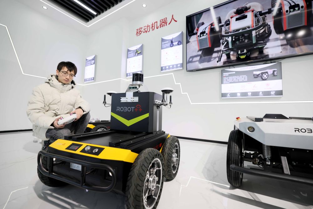在合肥市瑤海區的中國網(wǎng)谷,一家機器人公司的技術(shù)人員在調試智能機器人(2023年11月16日攝)。新華社發(fā)(解琛攝)