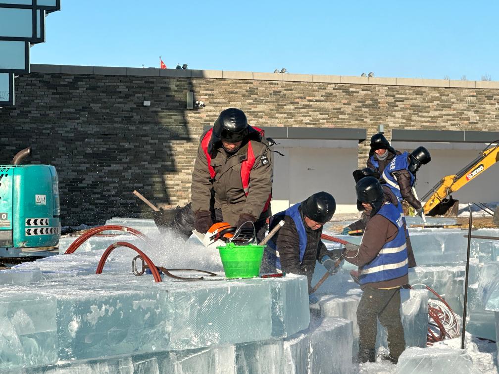 近日,在哈爾濱冰雪大世界建設現場(chǎng),工程車(chē)將一塊塊晶瑩剔透的冰磚鏟起,電鋸嗡鳴、冰屑飛舞之間,冰磚已被切割成合適的大小。不久后,這些冰磚將化為一座座冰雕,迎接各地游客的到來(lái)。