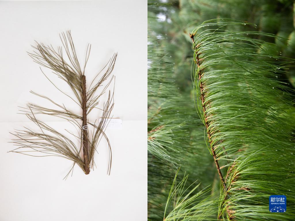 這是10月10日在昆明植物園拍攝的巧家五針松。這張拼版照片分別為科研人員野外采集的標本(左)和在植物園遷地保護后存活下來(lái)的同種植物。