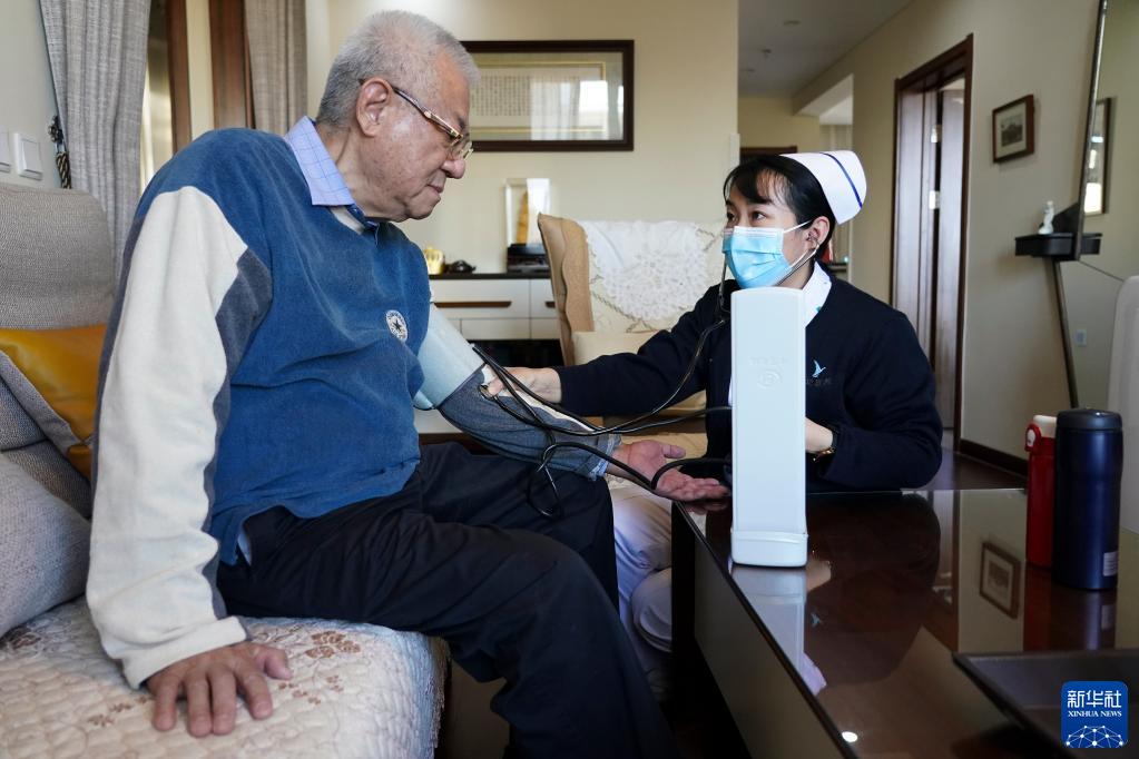 10月11日,在位于河北燕郊的燕達金色年華健康養護中心居家式養老公寓里,護士上門(mén)給呂偉業(yè)(左)測血壓。