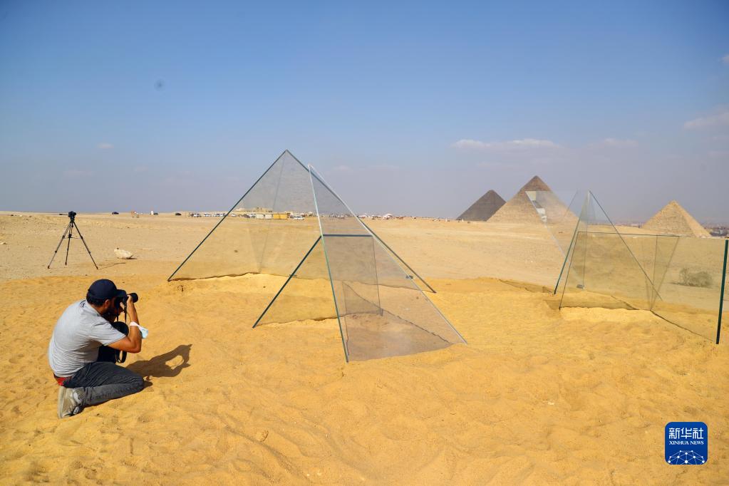 10月21日,游客在埃及吉薩金字塔景區舉辦的藝術(shù)展上拍攝一件藝術(shù)作品。
