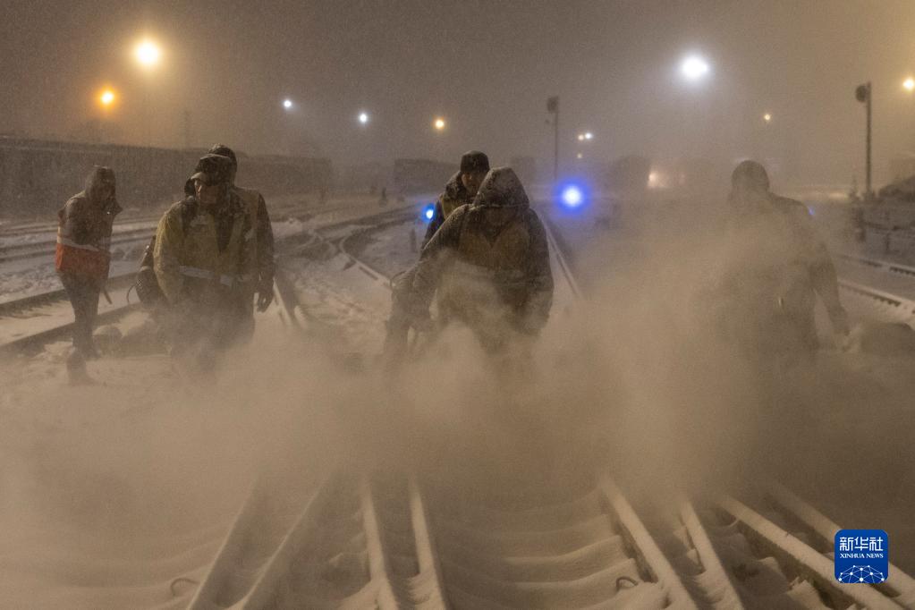 11月22日凌晨,在雞西站西場(chǎng),工作人員進(jìn)行清雪作業(yè)。