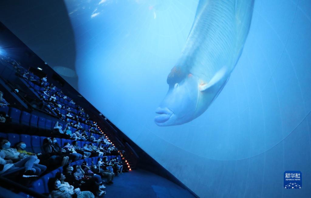 2021年5月2日,游客在上??萍拣^影院內觀(guān)看球幕電影《大堡礁探秘》。