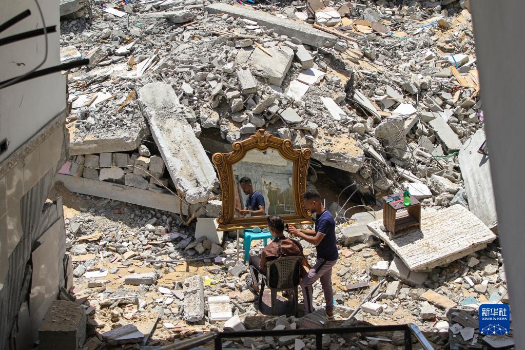2021年5月26日,在加沙地帶北部的城鎮貝特拉希亞,23歲的巴勒斯坦理發(fā)師阿卜杜拉·扎瓦拉在被以色列炸毀的自家房屋前為顧客免費服務(wù)。