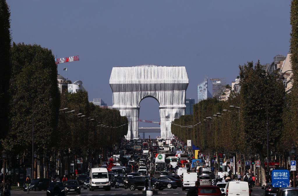 這是2021年9月21日在法國巴黎拍攝的“被包裹的凱旋門(mén)”?!氨话膭P旋門(mén)”是保加利亞已故藝術(shù)家赫里斯托和妻子讓娜-克洛德的遺作。根據他們的構思,巴黎地標建筑凱旋門(mén)被可回收的織物包裹起來(lái)。