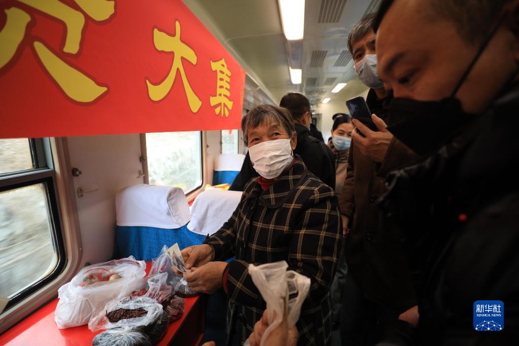 吉林通化至遼寧丹東的4318/7次列車(chē)是一輛行駛在東北東部山區的慢火車(chē)。為助力鄉村振興,中國鐵路沈陽(yáng)局集團有限公司吉林客運段在列車(chē)上開(kāi)辦“年貨大集”。沿線(xiàn)各村鎮的農民不用等到進(jìn)城,就可在車(chē)廂里售賣(mài)自家山貨。