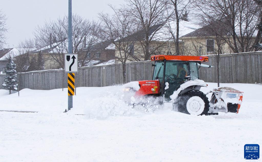 1月17日,在加拿大大多倫多地區米西索加,一輛除雪車(chē)為人行道清雪。