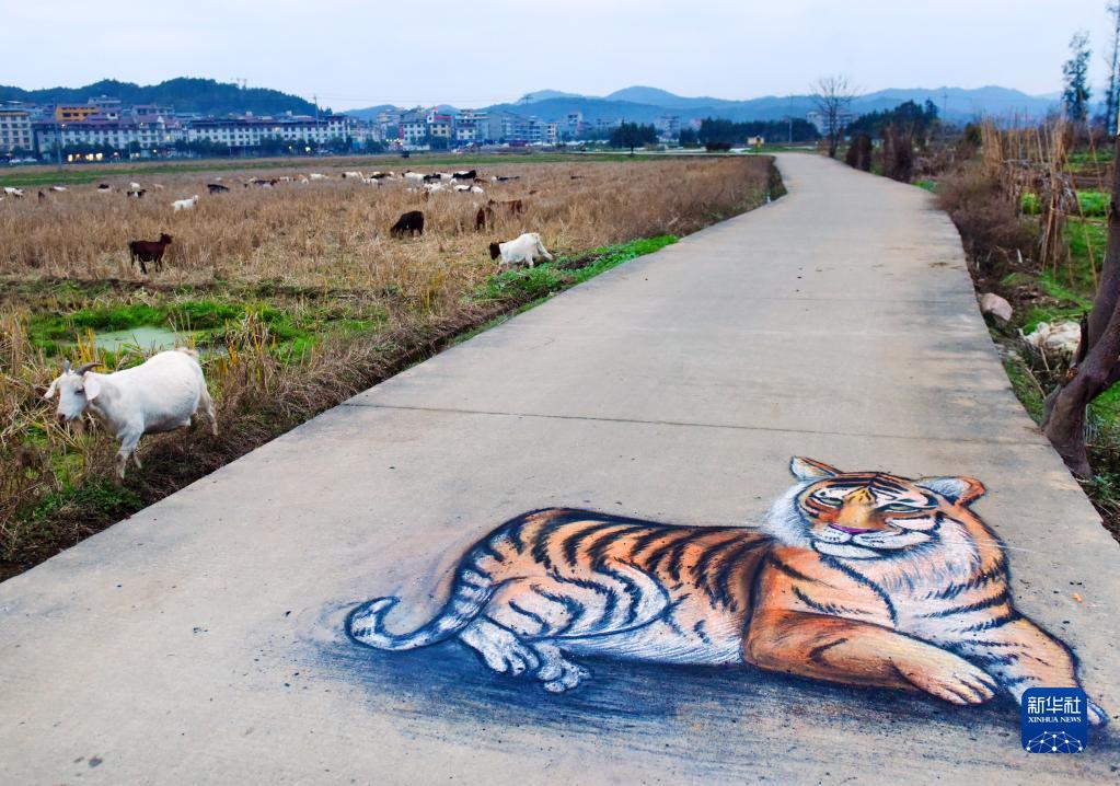 1月20日,在福建省南平市建陽(yáng)區徐市鎮田間小路上,一只羊從3D立體畫(huà)《老虎》邊上經(jīng)過(guò)。該3D立體畫(huà)由一名“90后”繪畫(huà)愛(ài)好者以木炭和粉筆繪制。